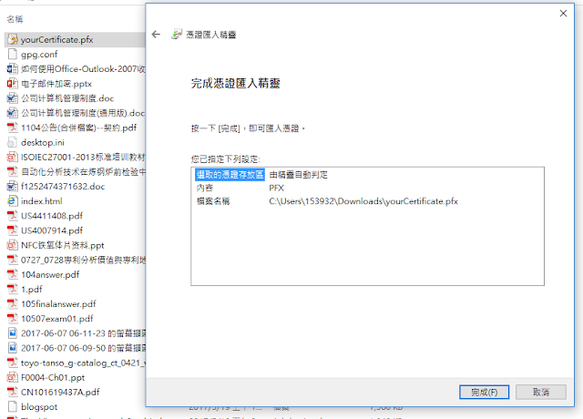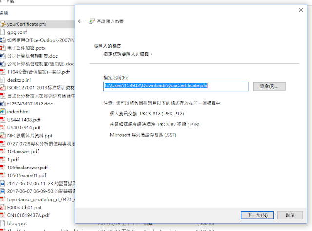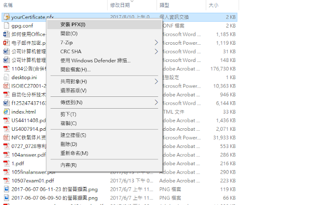 所以小弟最近就利用PFX檔+OUTLOOK的方式,建立加密的電子郵件傳輸方式,讓電子郵件在傳輸的時候更安全(至少心理上是這樣覺得啦!)。