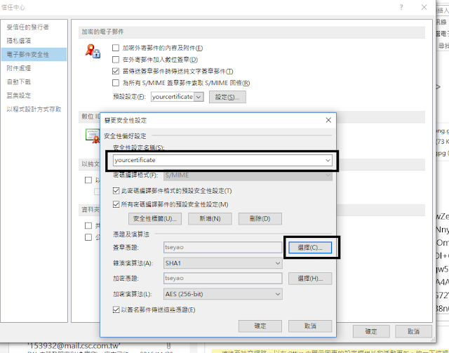 在加密的電子郵件→預設設定→設定,填入設定的名稱。在憑證及演算法的地方,點選[選擇]。